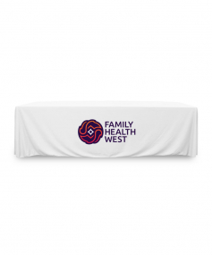 8 ft. Premium PolyKnit throw table cover with one color logo. Fits a 96 inch wide x 30 inch deep table. All corners are rounded meaning they will not gather and lay on the floor. Floor length on 4 sides. This cloth requires no ironing, is EasyCare machine washable and dryer safe.