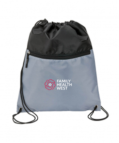 Sport bag with a contrast color front-zippered pocket, reinforced corners and a drawstring closure. Drawstrings double as backpack straps. 12 1/2" W x 15 1/2" H x 3/16" D.