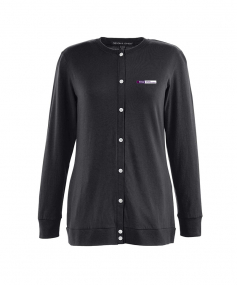 5 oz., 58% cotton, 39% modal, 3% spandex jersey; Soft modal blend drapes without clinging; Dyed-to-match grosgrain ribbon accents placket; Dura-Pearl buttons ideally spaced to avoid unflattering gaps; Banded rib knit cuffs and bottom hem; Longer 27" length (size medium) is ideal for wearing open or closed