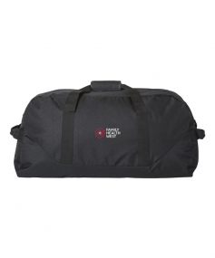 Black polyester 30" duffel bag with adjustable shoulder strap, side grip handles, and front zippered pocket.
