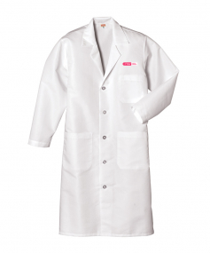 Our IL50-strength lab coat has side vent openings to allow you access to your clothing. 5-Ounce, 80/20 poly/combed cotton performance blend poplin with one-piece, lined, notched lapel. Left chest patch pocket with bartacked pencil stall. Features two lower pockets and 5-button closure.