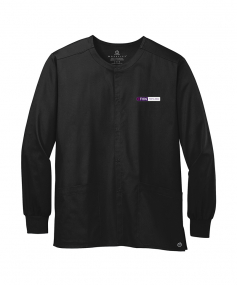 This is a WonderWink Unisex WorkFlex Snap-Front Scrub Jacket. Features 65/35 poly/cotton, mechanical stretch, 5-snap front closure, shoulder badge loop, rib knit cuff, and a top-loading front pockets (interior left hidden accessory loops).