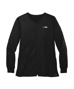 This jacket features 78/20/2 poly/rayon/spandex , zippered front closure, shoulder badge loop, rib knit cuffs, top-loading front pockets with interior pockets,side vents, wonderwink heat transfer logo at left pocket and a modern fit.